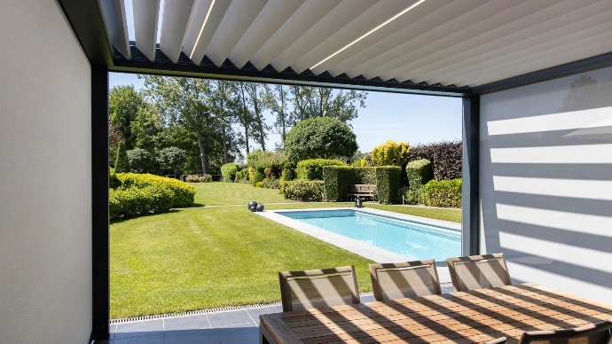 Dankzij de perfect aansluitende lamellen en geïntegreerde waterafvoer geniet je van een uitzonderlijk comfortabele buitenruimte, zelfs bij minder goed weer.