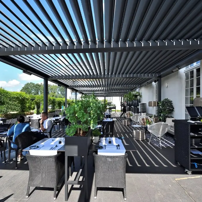 Onze stijlvolle Brustor overkappingen met lamellen-, doek- of glasdak creëren een comfortabele, beschutte plek waar je gasten graag blijven zitten, ongeacht het weer.